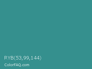 RYB 53,99,144 Color is a normal cyan color and the nearest color is Lochinvar #2c8c84. Hex code #35908e and RGB value is rgb(53,144,142). In RGB color space, this color is composed of 21% red, 56% green, 56% blue, In CMYK color space, this color is composed of 63% cyan, 0% magenta, 1% yellow , 44% black , In HSL color space, this color has a hue angle of 179° , 46% saturation and 39% lightness.
