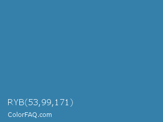 RYB 53,99,171 Color is a normal blue color and the nearest color is Astral #327da0. Hex code #3580ab and RGB value is rgb(53,128,171). In RGB color space, this color is composed of 21% red, 50% green, 67% blue, In CMYK color space, this color is composed of 69% cyan, 25% magenta, 0% yellow , 33% black , In HSL color space, this color has a hue angle of 202° , 53% saturation and 44% lightness.