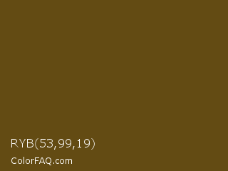 RYB 53,99,19 Color is a dark orange color and the nearest color is Horses Neck #604913. Hex code #634b13 and RGB value is rgb(99,75,19). In RGB color space, this color is composed of 39% red, 29% green, 7% blue, In CMYK color space, this color is composed of 0% cyan, 24% magenta, 81% yellow , 61% black , In HSL color space, this color has a hue angle of 42° , 68% saturation and 23% lightness.