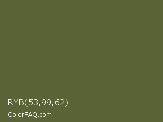 RYB 53,99,62 Color is a dark lime color and the nearest color is Verdigris #5d5e37. Hex code #5a6335 and RGB value is rgb(90,99,53). In RGB color space, this color is composed of 35% red, 39% green, 21% blue, In CMYK color space, this color is composed of 9% cyan, 0% magenta, 46% yellow , 61% black , In HSL color space, this color has a hue angle of 72° , 30% saturation and 30% lightness.