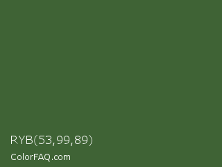 RYB 53,99,89 Color is a dark green color and the nearest color is Tom Thumb #3f583b. Hex code #3f6335 and RGB value is rgb(63,99,53). In RGB color space, this color is composed of 25% red, 39% green, 21% blue, In CMYK color space, this color is composed of 36% cyan, 0% magenta, 46% yellow , 61% black , In HSL color space, this color has a hue angle of 107° , 30% saturation and 30% lightness.