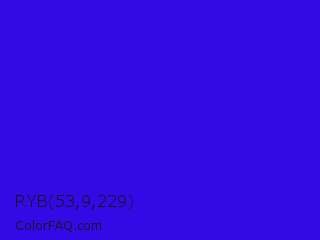 RYB 53,9,229 Color is a normal indigo color and the nearest color is Interdimensional Blue #360ccc. Hex code #3509e5 and RGB value is rgb(53,9,229). In RGB color space, this color is composed of 21% red, 4% green, 90% blue, In CMYK color space, this color is composed of 77% cyan, 96% magenta, 0% yellow , 10% black , In HSL color space, this color has a hue angle of 252° , 92% saturation and 47% lightness.
