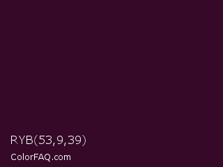 RYB 53,9,39 Color is a very dark magenta color and the nearest color is Melanzane #300529. Hex code #350927 and RGB value is rgb(53,9,39). In RGB color space, this color is composed of 21% red, 4% green, 15% blue, In CMYK color space, this color is composed of 0% cyan, 83% magenta, 26% yellow , 79% black , In HSL color space, this color has a hue angle of 319° , 71% saturation and 12% lightness.