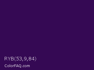 RYB 53,9,84 Color is a very dark purple color and the nearest color is Jagger #350e57. Hex code #350954 and RGB value is rgb(53,9,84). In RGB color space, this color is composed of 21% red, 4% green, 33% blue, In CMYK color space, this color is composed of 37% cyan, 89% magenta, 0% yellow , 67% black , In HSL color space, this color has a hue angle of 275° , 81% saturation and 18% lightness.