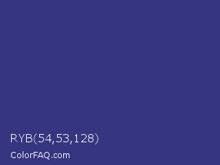 RYB 54,53,128 Color is a normal indigo color and the nearest color is Minsk #3f307f. Hex code #363580 and RGB value is rgb(54,53,128). In RGB color space, this color is composed of 21% red, 21% green, 50% blue, In CMYK color space, this color is composed of 58% cyan, 59% magenta, 0% yellow , 50% black , In HSL color space, this color has a hue angle of 241° , 41% saturation and 35% lightness.