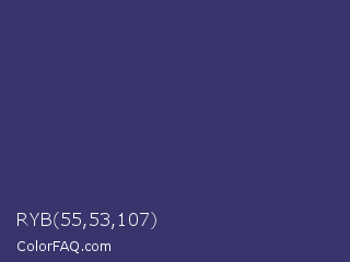 RYB 55,53,107 Color is a normal indigo color and the nearest color is Deep Koamaru #333366. Hex code #37356b and RGB value is rgb(55,53,107). In RGB color space, this color is composed of 22% red, 21% green, 42% blue, In CMYK color space, this color is composed of 49% cyan, 50% magenta, 0% yellow , 58% black , In HSL color space, this color has a hue angle of 242° , 34% saturation and 31% lightness.