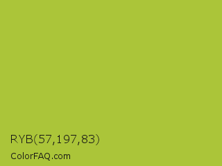 RYB 57,197,83 Color is a normal lime color and the nearest color is Android Green #a4c639. Hex code #abc539 and RGB value is rgb(171,197,57). In RGB color space, this color is composed of 67% red, 77% green, 22% blue, In CMYK color space, this color is composed of 13% cyan, 0% magenta, 71% yellow , 23% black , In HSL color space, this color has a hue angle of 71° , 55% saturation and 50% lightness.