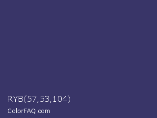 RYB 57,53,104 Color is a normal indigo color and the nearest color is Deep Koamaru #333366. Hex code #393568 and RGB value is rgb(57,53,104). In RGB color space, this color is composed of 22% red, 21% green, 41% blue, In CMYK color space, this color is composed of 45% cyan, 49% magenta, 0% yellow , 59% black , In HSL color space, this color has a hue angle of 245° , 32% saturation and 31% lightness.