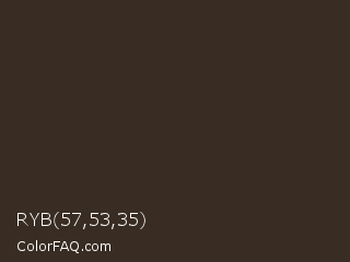RYB 57,53,35 Color is a very dark orange color and the nearest color is Birch #373021. Hex code #392d23 and RGB value is rgb(57,45,35). In RGB color space, this color is composed of 22% red, 18% green, 14% blue, In CMYK color space, this color is composed of 0% cyan, 21% magenta, 39% yellow , 78% black , In HSL color space, this color has a hue angle of 27° , 24% saturation and 18% lightness.