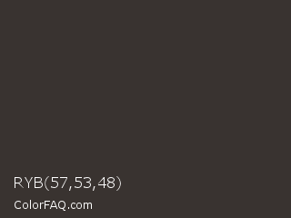 RYB 57,53,48 Color is a very dark orange color and the nearest color is Dune #383533. Hex code #393330 and RGB value is rgb(57,51,48). In RGB color space, this color is composed of 22% red, 20% green, 19% blue, In CMYK color space, this color is composed of 0% cyan, 11% magenta, 16% yellow , 78% black , In HSL color space, this color has a hue angle of 20° , 9% saturation and 21% lightness.