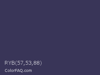 RYB 57,53,88 Color is a dark indigo color and the nearest color is Martinique #363050. Hex code #393558 and RGB value is rgb(57,53,88). In RGB color space, this color is composed of 22% red, 21% green, 35% blue, In CMYK color space, this color is composed of 35% cyan, 40% magenta, 0% yellow , 65% black , In HSL color space, this color has a hue angle of 247° , 25% saturation and 28% lightness.
