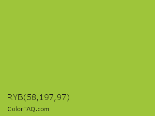 RYB 58,197,97 Color is a normal lime color and the nearest color is Android Green #a4c639. Hex code #9ec53a and RGB value is rgb(158,197,58). In RGB color space, this color is composed of 62% red, 77% green, 23% blue, In CMYK color space, this color is composed of 20% cyan, 0% magenta, 71% yellow , 23% black , In HSL color space, this color has a hue angle of 77° , 55% saturation and 50% lightness.
