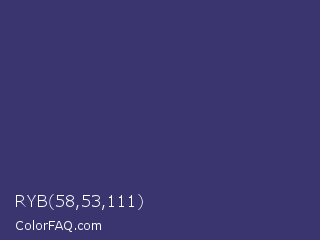 RYB 58,53,111 Color is a normal indigo color and the nearest color is Deep Koamaru #333366. Hex code #3a356f and RGB value is rgb(58,53,111). In RGB color space, this color is composed of 23% red, 21% green, 44% blue, In CMYK color space, this color is composed of 48% cyan, 52% magenta, 0% yellow , 56% black , In HSL color space, this color has a hue angle of 245° , 35% saturation and 32% lightness.