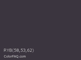 RYB 58,53,62 Color is a dark purple color and the nearest color is Tuna #353542. Hex code #3a353e and RGB value is rgb(58,53,62). In RGB color space, this color is composed of 23% red, 21% green, 24% blue, In CMYK color space, this color is composed of 6% cyan, 15% magenta, 0% yellow , 76% black , In HSL color space, this color has a hue angle of 273° , 8% saturation and 23% lightness.