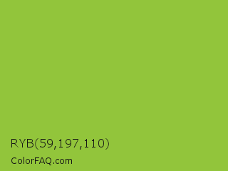 RYB 59,197,110 Color is a normal green color and the nearest color is Yellow Green #9acd32. Hex code #92c53b and RGB value is rgb(146,197,59). In RGB color space, this color is composed of 57% red, 77% green, 23% blue, In CMYK color space, this color is composed of 26% cyan, 0% magenta, 70% yellow , 23% black , In HSL color space, this color has a hue angle of 82° , 54% saturation and 50% lightness.