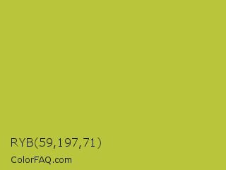 RYB 59,197,71 Color is a normal yellow color and the nearest color is Earls Green #c9b93b. Hex code #b9c53b and RGB value is rgb(185,197,59). In RGB color space, this color is composed of 73% red, 77% green, 23% blue, In CMYK color space, this color is composed of 6% cyan, 0% magenta, 70% yellow , 23% black , In HSL color space, this color has a hue angle of 65° , 54% saturation and 50% lightness.