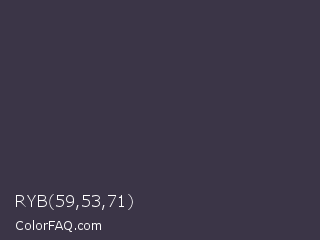 RYB 59,53,71 Color is a dark indigo color and the nearest color is Ship Gray #3e3a44. Hex code #3b3547 and RGB value is rgb(59,53,71). In RGB color space, this color is composed of 23% red, 21% green, 28% blue, In CMYK color space, this color is composed of 17% cyan, 25% magenta, 0% yellow , 72% black , In HSL color space, this color has a hue angle of 260° , 15% saturation and 24% lightness.