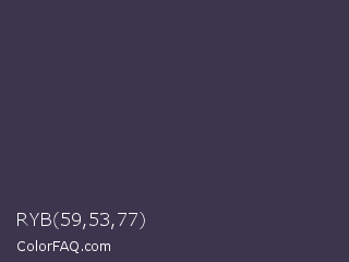 RYB 59,53,77 Color is a dark indigo color and the nearest color is Martinique #363050. Hex code #3b354d and RGB value is rgb(59,53,77). In RGB color space, this color is composed of 23% red, 21% green, 30% blue, In CMYK color space, this color is composed of 23% cyan, 31% magenta, 0% yellow , 70% black , In HSL color space, this color has a hue angle of 255° , 18% saturation and 25% lightness.