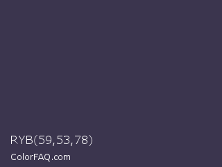 RYB 59,53,78 Color is a dark indigo color and the nearest color is Martinique #363050. Hex code #3b354e and RGB value is rgb(59,53,78). In RGB color space, this color is composed of 23% red, 21% green, 31% blue, In CMYK color space, this color is composed of 24% cyan, 32% magenta, 0% yellow , 69% black , In HSL color space, this color has a hue angle of 254° , 19% saturation and 26% lightness.