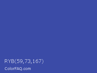 RYB 59,73,167 Color is a normal blue color and the nearest color is Violet Blue #324ab2. Hex code #3b4ba7 and RGB value is rgb(59,75,167). In RGB color space, this color is composed of 23% red, 29% green, 65% blue, In CMYK color space, this color is composed of 65% cyan, 55% magenta, 0% yellow , 35% black , In HSL color space, this color has a hue angle of 231° , 48% saturation and 44% lightness.