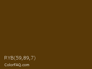 RYB 59,89,7 Color is a very dark orange color and the nearest color is Pineapple #563c0d. Hex code #593907 and RGB value is rgb(89,57,7). In RGB color space, this color is composed of 35% red, 22% green, 3% blue, In CMYK color space, this color is composed of 0% cyan, 36% magenta, 92% yellow , 65% black , In HSL color space, this color has a hue angle of 37° , 85% saturation and 19% lightness.