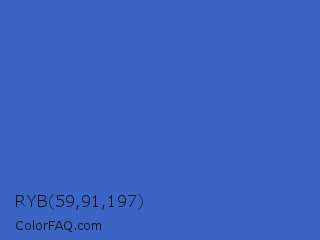 RYB 59,91,197 Color is a normal blue color and the nearest color is Han Blue #446ccf. Hex code #3b65c5 and RGB value is rgb(59,101,197). In RGB color space, this color is composed of 23% red, 40% green, 77% blue, In CMYK color space, this color is composed of 70% cyan, 49% magenta, 0% yellow , 23% black , In HSL color space, this color has a hue angle of 222° , 54% saturation and 50% lightness.