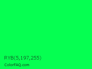 RYB 5,197,255 Color is a normal green color and the nearest color is Malachite #0bda51. Hex code #05ff51 and RGB value is rgb(5,255,81). In RGB color space, this color is composed of 2% red, 100% green, 32% blue, In CMYK color space, this color is composed of 98% cyan, 0% magenta, 68% yellow , 0% black , In HSL color space, this color has a hue angle of 138° , 100% saturation and 51% lightness.