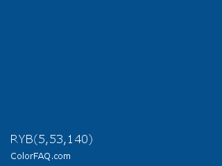 RYB 5,53,140 Color is a dark blue color and the nearest color is Congress Blue #02478e. Hex code #054f8c and RGB value is rgb(5,79,140). In RGB color space, this color is composed of 2% red, 31% green, 55% blue, In CMYK color space, this color is composed of 96% cyan, 44% magenta, 0% yellow , 45% black , In HSL color space, this color has a hue angle of 207° , 93% saturation and 28% lightness.