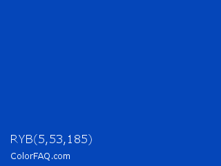 RYB 5,53,185 Color is a normal blue color and the nearest color is Absolute Zero #0048ba. Hex code #0546b9 and RGB value is rgb(5,70,185). In RGB color space, this color is composed of 2% red, 27% green, 73% blue, In CMYK color space, this color is composed of 97% cyan, 62% magenta, 0% yellow , 27% black , In HSL color space, this color has a hue angle of 218° , 95% saturation and 37% lightness.