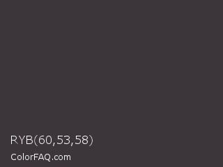 RYB 60,53,58 Color is a very dark magenta color and the nearest color is Masala #403b38. Hex code #3c353a and RGB value is rgb(60,53,58). In RGB color space, this color is composed of 24% red, 21% green, 23% blue, In CMYK color space, this color is composed of 0% cyan, 12% magenta, 3% yellow , 76% black , In HSL color space, this color has a hue angle of 317° , 6% saturation and 22% lightness.