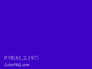 RYB 61,2,197 Color is a normal indigo color and the nearest color is Interdimensional Blue #360ccc. Hex code #3d02c5 and RGB value is rgb(61,2,197). In RGB color space, this color is composed of 24% red, 1% green, 77% blue, In CMYK color space, this color is composed of 69% cyan, 99% magenta, 0% yellow , 23% black , In HSL color space, this color has a hue angle of 258° , 98% saturation and 39% lightness.