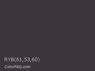 RYB 61,53,60 Color is a very dark magenta color and the nearest color is Masala #403b38. Hex code #3d353c and RGB value is rgb(61,53,60). In RGB color space, this color is composed of 24% red, 21% green, 24% blue, In CMYK color space, this color is composed of 0% cyan, 13% magenta, 2% yellow , 76% black , In HSL color space, this color has a hue angle of 308° , 7% saturation and 22% lightness.