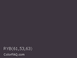 RYB 61,53,63 Color is a dark purple color and the nearest color is Ship Gray #3e3a44. Hex code #3d353f and RGB value is rgb(61,53,63). In RGB color space, this color is composed of 24% red, 21% green, 25% blue, In CMYK color space, this color is composed of 3% cyan, 16% magenta, 0% yellow , 75% black , In HSL color space, this color has a hue angle of 288° , 9% saturation and 23% lightness.