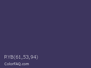 RYB 61,53,94 Color is a dark indigo color and the nearest color is Deep Koamaru #333366. Hex code #3d355e and RGB value is rgb(61,53,94). In RGB color space, this color is composed of 24% red, 21% green, 37% blue, In CMYK color space, this color is composed of 35% cyan, 44% magenta, 0% yellow , 63% black , In HSL color space, this color has a hue angle of 252° , 28% saturation and 29% lightness.