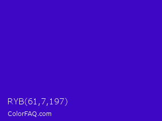 RYB 61,7,197 Color is a normal indigo color and the nearest color is Interdimensional Blue #360ccc. Hex code #3d07c5 and RGB value is rgb(61,7,197). In RGB color space, this color is composed of 24% red, 3% green, 77% blue, In CMYK color space, this color is composed of 69% cyan, 96% magenta, 0% yellow , 23% black , In HSL color space, this color has a hue angle of 257° , 93% saturation and 40% lightness.