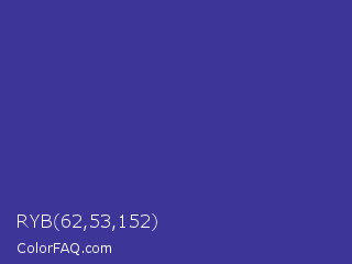 RYB 62,53,152 Color is a normal indigo color and the nearest color is Blue Pigment #333399. Hex code #3e3598 and RGB value is rgb(62,53,152). In RGB color space, this color is composed of 24% red, 21% green, 60% blue, In CMYK color space, this color is composed of 59% cyan, 65% magenta, 0% yellow , 40% black , In HSL color space, this color has a hue angle of 245° , 48% saturation and 40% lightness.