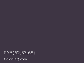 RYB 62,53,68 Color is a dark purple color and the nearest color is Ship Gray #3e3a44. Hex code #3e3544 and RGB value is rgb(62,53,68). In RGB color space, this color is composed of 24% red, 21% green, 27% blue, In CMYK color space, this color is composed of 9% cyan, 22% magenta, 0% yellow , 73% black , In HSL color space, this color has a hue angle of 276° , 12% saturation and 24% lightness.