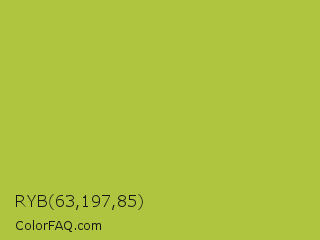 RYB 63,197,85 Color is a normal yellow color and the nearest color is Android Green #a4c639. Hex code #afc53f and RGB value is rgb(175,197,63). In RGB color space, this color is composed of 69% red, 77% green, 25% blue, In CMYK color space, this color is composed of 11% cyan, 0% magenta, 68% yellow , 23% black , In HSL color space, this color has a hue angle of 70° , 54% saturation and 51% lightness.