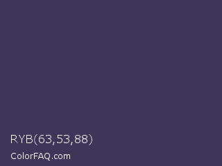 RYB 63,53,88 Color is a dark indigo color and the nearest color is Martinique #363050. Hex code #3f3558 and RGB value is rgb(63,53,88). In RGB color space, this color is composed of 25% red, 21% green, 35% blue, In CMYK color space, this color is composed of 28% cyan, 40% magenta, 0% yellow , 65% black , In HSL color space, this color has a hue angle of 257° , 25% saturation and 28% lightness.