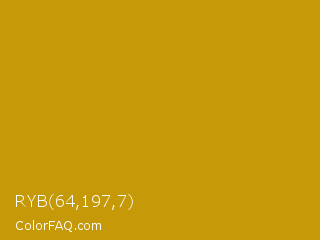 RYB 64,197,7 Color is a normal yellow color and the nearest color is Buddha Gold #c1a004. Hex code #c59907 and RGB value is rgb(197,153,7). In RGB color space, this color is composed of 77% red, 60% green, 3% blue, In CMYK color space, this color is composed of 0% cyan, 22% magenta, 96% yellow , 23% black , In HSL color space, this color has a hue angle of 46° , 93% saturation and 40% lightness.