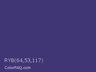 RYB 64,53,117 Color is a normal indigo color and the nearest color is Minsk #3f307f. Hex code #403575 and RGB value is rgb(64,53,117). In RGB color space, this color is composed of 25% red, 21% green, 46% blue, In CMYK color space, this color is composed of 45% cyan, 55% magenta, 0% yellow , 54% black , In HSL color space, this color has a hue angle of 250° , 38% saturation and 33% lightness.