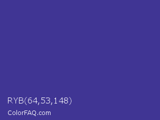 RYB 64,53,148 Color is a normal indigo color and the nearest color is Blue Pigment #333399. Hex code #403594 and RGB value is rgb(64,53,148). In RGB color space, this color is composed of 25% red, 21% green, 58% blue, In CMYK color space, this color is composed of 57% cyan, 64% magenta, 0% yellow , 42% black , In HSL color space, this color has a hue angle of 247° , 47% saturation and 39% lightness.