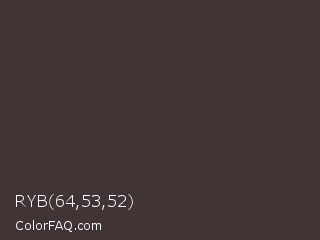 RYB 64,53,52 Color is a dark red color and the nearest color is Masala #403b38. Hex code #403534 and RGB value is rgb(64,53,52). In RGB color space, this color is composed of 25% red, 21% green, 20% blue, In CMYK color space, this color is composed of 0% cyan, 17% magenta, 19% yellow , 75% black , In HSL color space, this color has a hue angle of 5° , 10% saturation and 23% lightness.