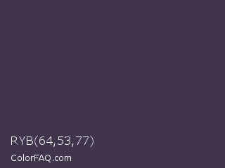 RYB 64,53,77 Color is a dark violet color and the nearest color is Ship Gray #3e3a44. Hex code #40354d and RGB value is rgb(64,53,77). In RGB color space, this color is composed of 25% red, 21% green, 30% blue, In CMYK color space, this color is composed of 17% cyan, 31% magenta, 0% yellow , 70% black , In HSL color space, this color has a hue angle of 268° , 18% saturation and 25% lightness.