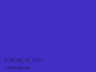 RYB 65,47,197 Color is a normal indigo color and the nearest color is Ocean Blue #4f42b5. Hex code #412fc5 and RGB value is rgb(65,47,197). In RGB color space, this color is composed of 25% red, 18% green, 77% blue, In CMYK color space, this color is composed of 67% cyan, 76% magenta, 0% yellow , 23% black , In HSL color space, this color has a hue angle of 247° , 61% saturation and 48% lightness.