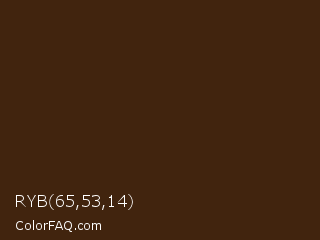 RYB 65,53,14 Color is a very dark orange color and the nearest color is Deep Oak #412010. Hex code #41240e and RGB value is rgb(65,36,14). In RGB color space, this color is composed of 25% red, 14% green, 5% blue, In CMYK color space, this color is composed of 0% cyan, 45% magenta, 78% yellow , 75% black , In HSL color space, this color has a hue angle of 26° , 65% saturation and 15% lightness.