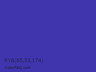 RYB 65,53,174 Color is a normal indigo color and the nearest color is Governor Bay #2f3cb3. Hex code #4135ae and RGB value is rgb(65,53,174). In RGB color space, this color is composed of 25% red, 21% green, 68% blue, In CMYK color space, this color is composed of 63% cyan, 70% magenta, 0% yellow , 32% black , In HSL color space, this color has a hue angle of 246° , 53% saturation and 45% lightness.