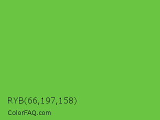 RYB 66,197,158 Color is a normal green color and the nearest color is Green RYB #66b032. Hex code #69c542 and RGB value is rgb(105,197,66). In RGB color space, this color is composed of 41% red, 77% green, 26% blue, In CMYK color space, this color is composed of 47% cyan, 0% magenta, 66% yellow , 23% black , In HSL color space, this color has a hue angle of 102° , 53% saturation and 52% lightness.