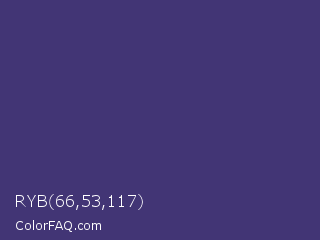 RYB 66,53,117 Color is a normal indigo color and the nearest color is Minsk #3f307f. Hex code #423575 and RGB value is rgb(66,53,117). In RGB color space, this color is composed of 26% red, 21% green, 46% blue, In CMYK color space, this color is composed of 44% cyan, 55% magenta, 0% yellow , 54% black , In HSL color space, this color has a hue angle of 252° , 38% saturation and 33% lightness.