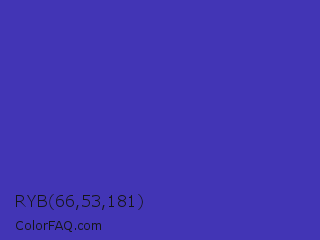 RYB 66,53,181 Color is a normal indigo color and the nearest color is Ocean Blue #4f42b5. Hex code #4235b5 and RGB value is rgb(66,53,181). In RGB color space, this color is composed of 26% red, 21% green, 71% blue, In CMYK color space, this color is composed of 64% cyan, 71% magenta, 0% yellow , 29% black , In HSL color space, this color has a hue angle of 246° , 55% saturation and 46% lightness.